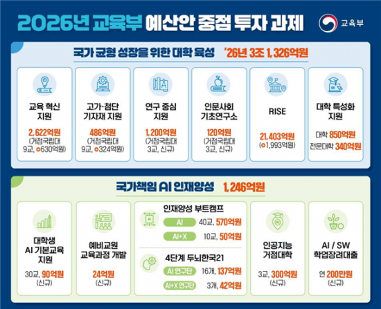눈에 띄는 대목은 대학 육성 예산의 증가다. 교육부는 국가 균형 성장을 위한 거점국립대 집중 육성 및 지역혁신중심 대학지원체계(RISE·라이즈) 등 대학 육성에 3조1326억원을 편성했다.