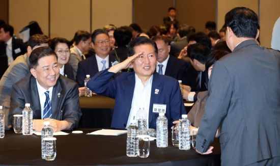 정청래 더불어민주당 대표가 29일 인천 중구 영종도 파라다이스시티호텔에서 열린 2025년 정기국회 대비 국회의원 워크숍에서 김병주 의원과 거수경계를 하고 있다.