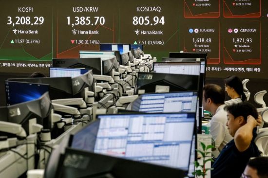 코스피 지수가 전 거래일 대비 12.48포인트 상승한 3208.80으로 장을 시작한 29일 서울 중구 하나은행 본점 딜링룸에서 딜러들이 업무를 보고 있다. 이날 원달러환율은 전 거래일 대비 2.6원 내린 1385원에 거래를 시작했다. 2025.8.29 강진형 기자