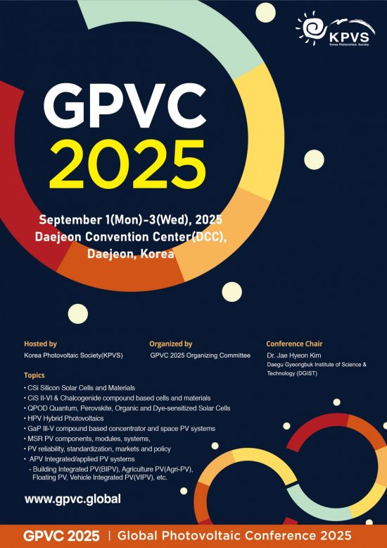 대전시와 한국태양광발전학회가 공동 주최하는 '2025 글로벌태양광학술대회(GPVC 2025)'가 9월 1일부터 3일까지 대전컨벤션센터(DCC)에서 열린다.