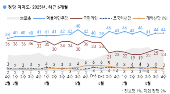 정당지지도에서는 민주당 지지율이 지난주와 같은 44%로 조사됐다. 국민의힘은 2%포인트 하락한 23%로 나타났다. 개혁신당은 3%, 조국혁신당은 2%로 조사됐다.