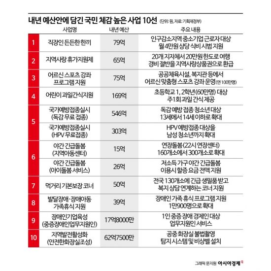 65세 이상 어르신이 공공체육시설과 복지관 등에서 맞춤형 스포츠 강좌를 무료로 들을 수 있도록 하는 사업에는 75억원이 신규 투입된다. 이를 통해 연 100만명의 어르신이 소득과 무관하게 혜택을 누리게 된다. 또 전국 초등 늘봄학교 맞춤형 교실에 참여하는 1~2학년 성장기 학생에게 국산 과일과 과채로 구성된 간식을 주 1회 제공하는 사업에는 169억원 예산이 쓰일 예정이다.