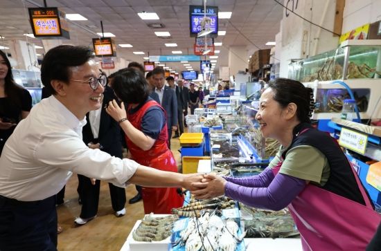 전재수 해양수산부 장관이 29일 서울 노량진 수산시장을 방문, 시장 상인들과 인사를 나누고 있다.