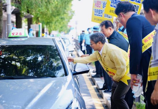 강기정 광주시장이 29일 오후 유스퀘어 광장 앞 시내버스 택시 하차장에서 연일 계속되는 폭염에 시달리는 운수종사자들에게 생수를 전달하고 있다. 이날 캠페인은 (사)광주교통경제인단체협의회가 주최·주관했으며, 협의회 회원, 버스조합, 개인택시조합 관계자 등 30여명이 참여했다. 광주시 제공