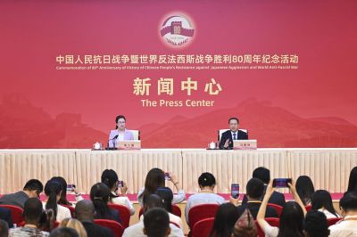 마자오쉬 중국 외교부 부부장(오른쪽)이 29일(현지시간) 베이징에서 열린 '항일전쟁 및 세계 반파시스트 전쟁(제2차 세계대전) 승전 80주년'(전승절 80주년) 기자회션에서 발언하고 있다. 신화연합뉴스