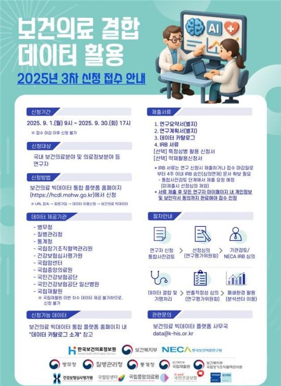 한편, 한국보건의료정보원과 한국보건의료연구원은 이달 30일까지 보건의료 빅데이터 플랫폼을 통한 2025년 제3차 보건의료 결합 데이터 활용 신청을 접수한다. 연구자는 10개 기관이 제공하는 72종 데이터셋(1만6823개 항목) 중 연구 목적에 맞는 데이터를 신청해 이용할 수 있다. 보건의료 빅데이터 플랫폼 홈페이지에서 상세한 데이터 목록을 확인하면 된다.