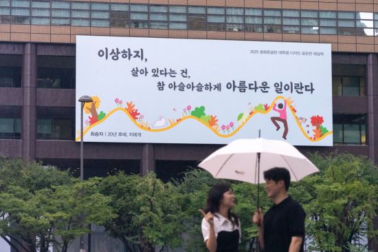 대상 수상자인 조혜준씨(20·한국교원대)는 곡선 그래프를 모티브 삼아 삶을 상징적으로 표현했다. 오르내리는 곡선 위에서 각자의 방식으로 삶을 살아가는 생명체의 모습을 그렸다. 균형과 불안 사이를 아슬아슬 오가며 꿋꿋이 견뎌내는 존재의 아름다움을 보여주고자 했다. 조씨는 "누군가의 하루에 작은 힘이 되고 싶은 마음에 공모전에 참여했다"며 "직접 디자인한 작품이 내걸리게 돼 뜻깊다"고 소감을 전했다.