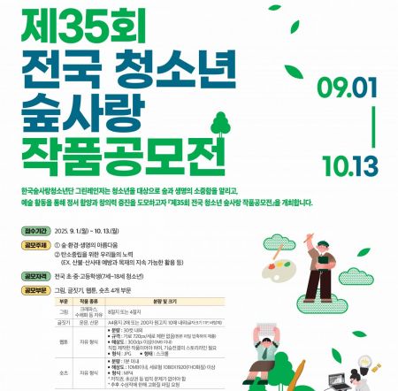 송준호 산림청 산림복지국장은 "공모전을 통해 청소년이 자연과 생명의 소중함을 되새기는 시간을 갖게 되길 바란다"며 "나아가 청소년의 창의적 아이디어가 기후위기 극복과 산불·산사태 등 산림재난 예방에 기여할 수 있길 기대한다"고 밝혔다.