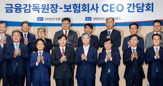 이찬진 금융감독원장(앞줄 가운데)이 1일 서울 종로구 생명보험교육문화센터에서 열린 '금융감독원장-보험회사 CEO 간담회'에 참석해 보험회사 CEO들과 기념사진촬영 하고 있다.