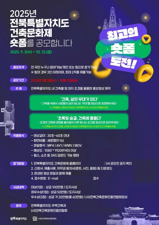 전북도가 오는 11월 열리는 '제26회 전북특별자치도 건축문화제'를 앞두고 도민과 국민 누구나 참여할 수 있는 숏폼 영상 공모전을 연다.