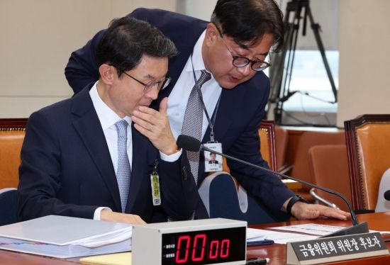 이억원 금융위원장 후보자가 2일 국회 정무위원회에서 열린 인사청문회에서 관계자와 대화하고 있다.