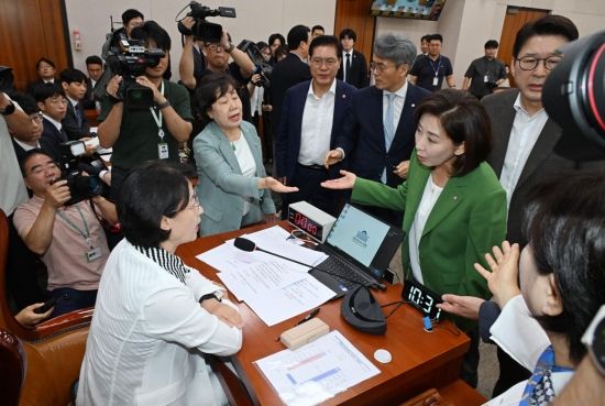 2일 국회에서 열린 법제사법위원회 전체회의에서 나경원 국민의힘 의원 등이 추미애 위원장의 회의 진행 방식에 항의하며 더불어민주당 의원들과 언쟁하고 있다.