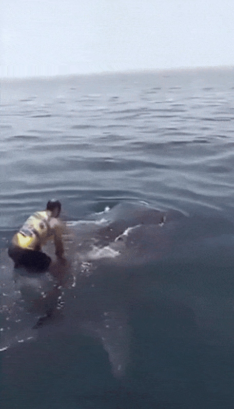 고래상어가 접근했을 때 놀란 이 여성과 달리 지난달 28일 한 남성은 고래상어의 지느러미를 붙잡고 등에 올라탄 뒤, 손뼉을 치며 춤을 추는 모습을 공유해 누리꾼의 비판을 받기도 했다. 데일리메일