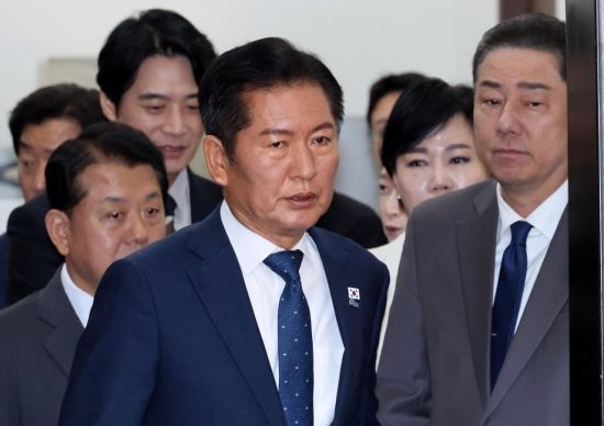 정청래 더불어민주당 대표와 김병기 원내대표 등 지도부가 3일 국회에서 열린 최고위원회의에 참석하고 있다.