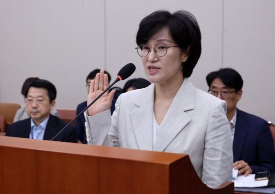 원민경 여성가족부 장관 후보자가 3일 국회 여성가족위원회에서 열린 인사청문회에서 선서하고 있다.