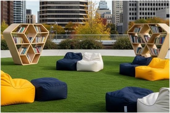 야외도서관 공간은 두 개 블록으로 구성된다. 발산역 1번 출구 인근 보도에는 비행기 모양의 책장과 다양한 벤치를 마련해 독서를 즐길 수 있는 ‘리딩존’을 조성했다. 또 다른 공간에서는 서가와 함께 주말 오후 3시에 진행될 체험·강연·공연 프로그램이 준비돼 있다.