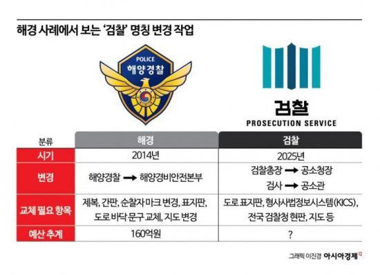 과거 해양경찰청이 국민안전처로 편입되고 이름이 '해양경찰'에서 '해양경비안전본부'로 바뀔 당시 간판·제복·함정 도색 등에 160억원의 예산 추산이 나왔다. 그때도 '소모성 비용'이란 비판이 높았다. 검찰 명칭 변경에도 수백억 원대의 혈세가 쓰일 가능성이 크다. 그러나 관련 비용추계조차 나오지 않고 있다.