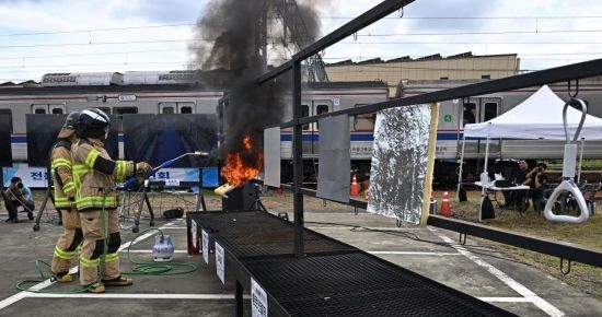 4일 경기도 고양시 지축차량기지에서 열린 전동차 화재 시연 현장에서 소방 관계자가 전동차 내장재 6종에 대한 방염 성능 테스트를 하고 있다.
