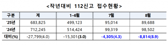 올해 1~8월 112 신고는 68만 3825건으로 작년 같은 기간 71만 2245건보다 2만 7799건 줄어든 것으로 나타났다.