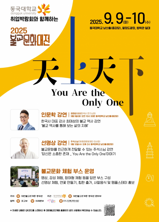 대한불교조계종 총무원 문화부는 오는 9~10일 동국대학교에서 2025 불교문화대전 '天上天下 You Are the Only One'을 개최한다고 5일 밝혔다.