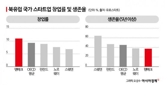 덴마크 산업통상부가 발간한 '덴마크 스타트업 생태계 분석' 최신판에 따르면 덴마크 스타트업의 5년 후 생존율은 36%로 다른 북유럽 국가 스웨덴(63%)·핀란드(48%)·노르웨이(37%) 등에 비해 낮다. 이는 덴마크가 스웨덴·노르웨이 보다 창업률이 훨씬 더 높다는 점에 기인한다. 덴마크의 창업률은 10% 이상으로 국제협력개발기구(OECD) 평균보다도 높다.
