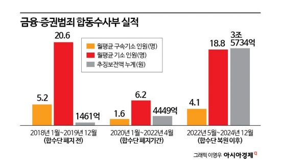 8일 아시아경제가 확보한 자료에 따르면 금융·증권범죄 합동수사부의 실적은 합수단 폐지 이전인 2018년 1월~2019년 12월에는 월평균 구속기소 인원이 5.2명, 월평균 기소 인원 20.6명 수준이었다. 그러나 폐지됐던 기간인 2020년 1월~2022년 4월에는 각각 1.6명, 6.2명으로 급감했다. 기소 인원은 69.9%, 구속기소 인원은 69.2% 줄어들었다.