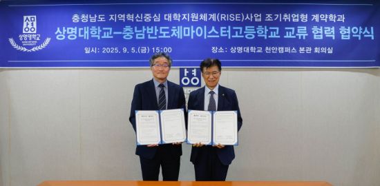 상명대학교는 지난 5일 천안 캠퍼스 본관 회의실에서 충남반도체마이스터고와 충남 지역 기업 맞춤형 인재 양성과 정주(定住) 지원을 위한 업무협약(MOU)을 체결했다고 8일 밝혔다.