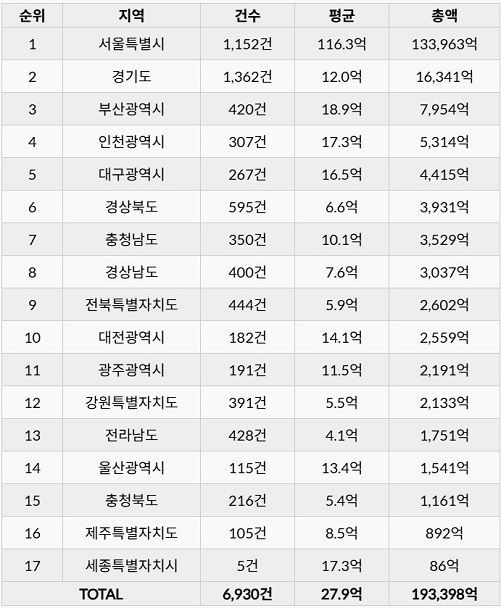 상업용 부동산 빌딩매매, 건물매매 실거래 조사업체인 유한회사 실거래 닷컴은 2025년 1월~8월까지 전국 빌딩매매, 건물매매 총 거래금액은 19.4조에 달한다고 발표했다. 서울시가 13.4조로 1위를 차지했고, 경기도 1조 6천억, 3위 부산(7,954억), 인천(5,314억), 세종특별자치시가 17위 최하위로 86억 팔린 것으로 조사됐다.