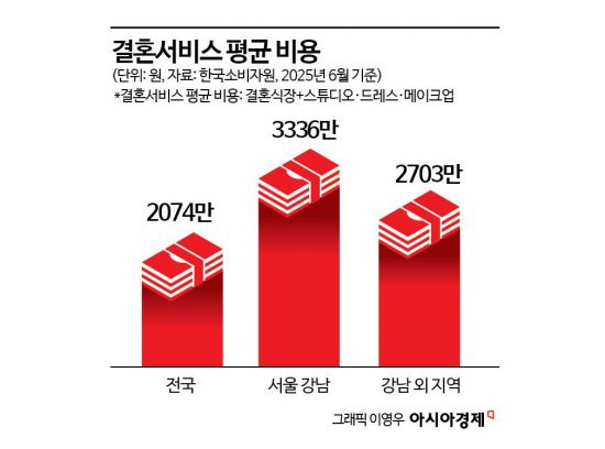 11일 한국소비자원에 따르면 지난 6월 기준 전국 평균 결혼 서비스 비용은 2074만원으로 집계됐다. 결혼 서비스 비용은 결혼식장 비용과 스드메(스튜디오·드레스·메이크업) 비용을 합친 금액이다. 수도권의 경우 비용이 더 높게 나타났는데 서울 강남권은 평균 3336만원, 강남 외 서울 지역은 2703만원으로 조사됐다.