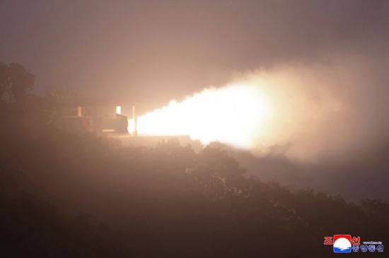 조선중앙통신은 9일 북한 미사일총국은 전날 화학재료연구원과 함께 탄소섬유 복합재료를 이용한 대출력 고체 발동기(엔진) 지상분출시험을 다시 진행했다고 보도했다. 이날 시험엔 김 위원장이 직접 참관했다.