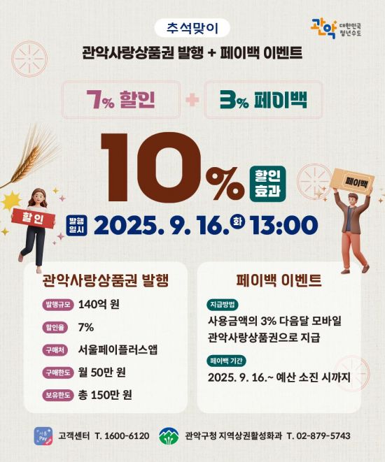 서울 관악구(구청장 박준희)가 이달 16일 오후 1시부터 140억원 규모의 ‘관악사랑상품권’을 발행한다. 이번 상품권은 추석 명절을 앞두고 구민 경제 부담 완화와 지역 소상공인 매출 증대를 위해 기획됐다.