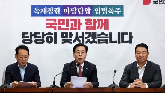 송언석 국민의힘 원내대표가 9일 국회에서 열린 원내대책회의에서 발언하고 있다.