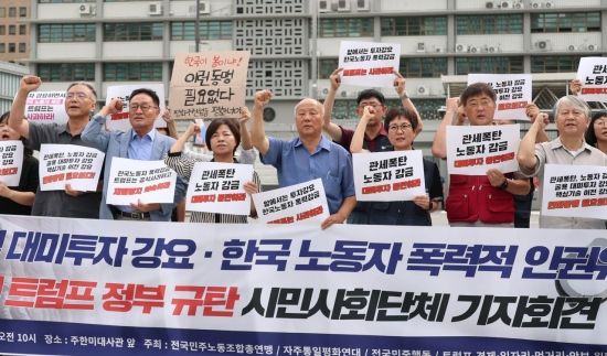 9일 서울 종로구 주한미대사관 앞에서 민주노총 및 시민사회단체들이 한국노동자에 대한 폭력적 인권유린, 트럼프 정부를 규탄하는 기자회견을 하고 있다.