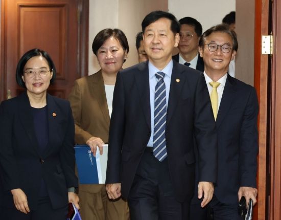 구윤철 경제부총리 겸 기획재정부 장관이 10일 서울 종로구 정부서울청사에서 열린 성장전략TF 겸 산업경쟁력강화 관계장관회의에 참석 하고 있다. 왼쪽부터 한성숙 중소벤처기업부 장관, 송미령 농림축산식품부 장관, 구 부총리, 전재수 해양수산부 장관.