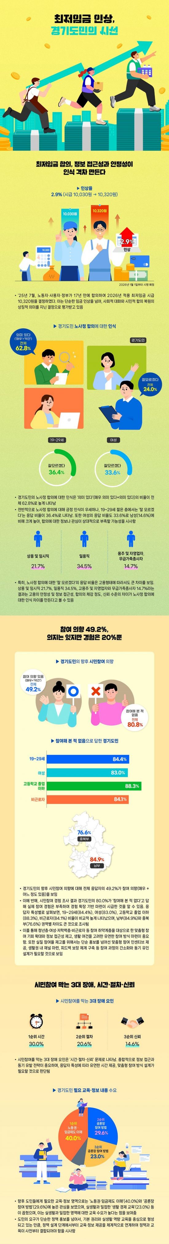 경기도민 10명 중 6명은 17년 만에 노사정 합의로 결정된 2026년 최저임금(시급 1만320원)에 대해 긍정적으로 평가한 것으로 나타났다. 반면 청년·여성층·일용직 근로자는 합의에 대한 평가를 유보하거나 응답하지 않은 비율이 상대적으로 높았다.