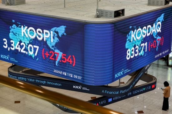 코스피 지수가 전 거래일 보다 22.07포인트 오른 3336.60으로 장을 시작하며 이틀 연속 사상최고치를 경신한 11일 서울 여의도 한국거래소 전광판에 코스피와 코스닥 지수가 표시돼 있다.