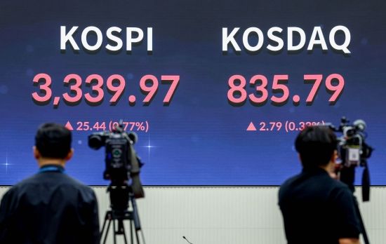 코스피 지수가 전 거래일 보다 22.07포인트 오른 3336.60으로 장을 시작하며 이틀 연속 사상최고치를 경신한 11일 서울 여의도 한국거래소 전광판에 코스피와 코스닥 지수가 표시돼 있다.