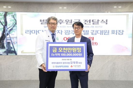 정신 전남대병원장은 "김대원 회장의 꾸준한 나눔과 따뜻한 마음은 많은 환자와 그 가족들에게 큰 희망이 되고 있다"며 "기탁해주신 후원금이 환자들에게 실질적인 도움이 될 수 있도록 소중히 사용하겠다"고 말했다.