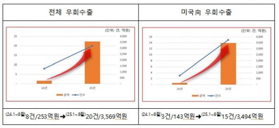 이는 전체 우회수출 규모에서 미국을 향한 우회수출의 비중 변화에서도 확인할 수 있다. 미국향 우회수출 비중은 ▲2021년 건수 20%·금액 15% ▲2022년 건수 23%·금액 35% ▲2023년 건수 12%·금액 3% ▲2024년 건수 40%·금액 62% ▲올해(1~8월) 건수 75%·금액 98% 등으로 집계된다. 지난해와 올해는 이례적으로 미국향 우회수출 비중이 수직 상승했다.