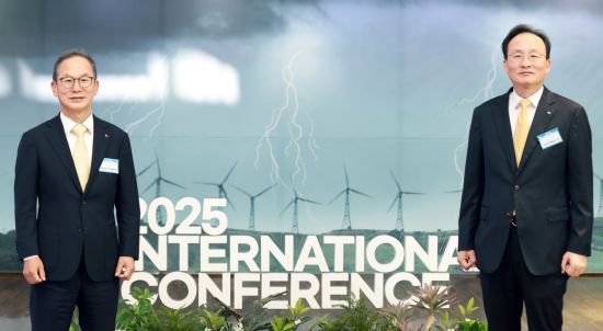 지난 11일 서울 이화여자대학교 ECC 이삼봉홀에서 열린 '2025 국제 컨퍼런스'에서 양종희 KB금융회장(왼쪽)과 이환주 KB국민은행장이 기념촬영을 하고 있다. KB국민은행 제공