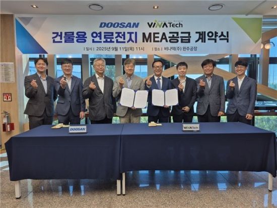 친환경 에너지 저장장치 전문기업 비나텍은 두산모빌리티이노베이션과 건물용 수소연료전지에 적용되는 막전극접합체(MEA) 공급계약을 체결했다고 12일 밝혔다. 비나텍은 이번 계약을 통해 국내 건물용 연료전지 시장의 주요 3시에 자사 MEA를 모두 적용시킴으로써 시장을 석권하게 됐다.