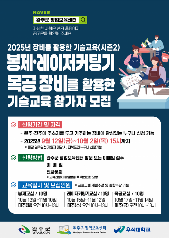 전북 완주군 창업보육센터가 보유 장비를 활용한 실습 중심의 '2025년 장비 활용 기술교육(시즌2)' 참가자를 모집한다.