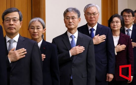[속보] 법원장회의 "사법부 신뢰 회복 위해 최선…신속·공정 재판" 조희대 대법원장이 15일 서울 서초구 대법원 대회의실에서 열린 전국법원장회의에서 대법관들과 국민의례를 하고 있다. 사진=사진공동취재단