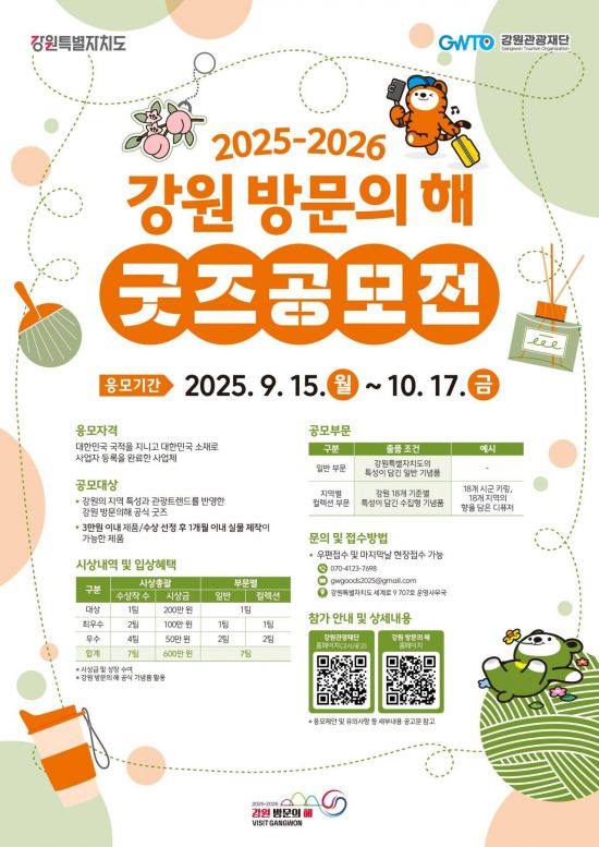 강원특별자치도와 강원관광재단은 '2025-2026 강원 방문의 해'를 기념하여 강원특별자치도의 다채로운 매력을 담은 관광 기념품을 발굴하고자 '굿즈 공모전'을 개최한다. 15일부터 10월 17일까지 한 달간 진행되는 이번 공모전은 대한민국 국적을 지니고 대한민국에 소재하며 사업자 등록을 완료한 사업자라면 누구나 참여할 수 있다.