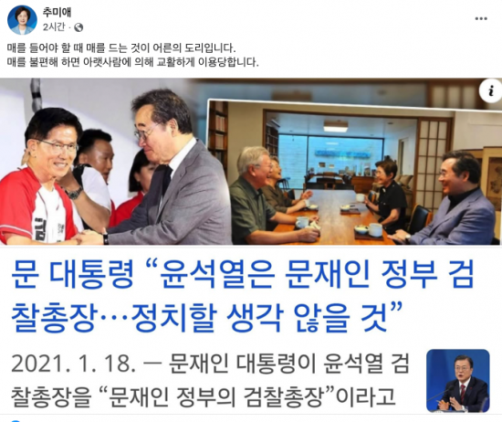 추미애 더불어민주당 의원이 이낙연 새미래민주당 상임고문과 만난 문재인 전 대통령을 향해 "매를 들어야 할 때 매를 드는 것이 어른의 도리"라고 지적했다. 15일 추 의원은 사회관계망서비스(SNS)에 "매를 불편해하면 아랫사람에 의해 교활하게 이용당한다"며 이같이 적었다. 문 전 대통령과 이 상임고문의 회동 사진, 지난 6월 대선을 앞두고 김문수 국민의힘 후보와 악수하고 있는 이 상임고문의 사진을 함께 게재했다.