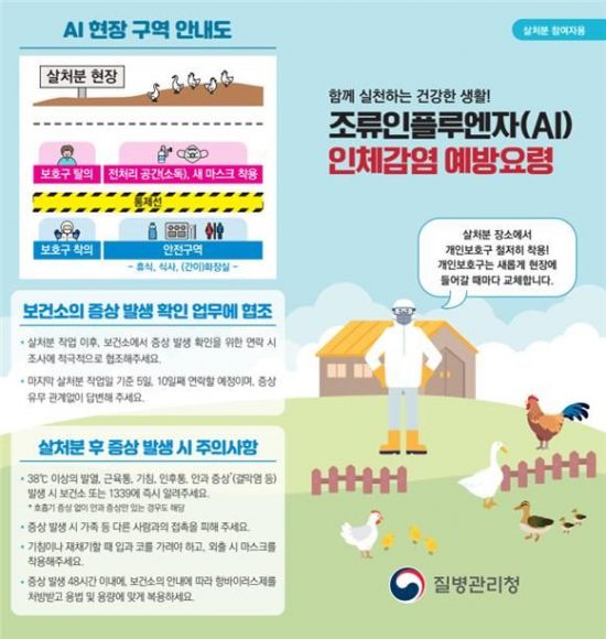 질병청은 농장 종사자 및 살처분 관련 작업 참여자에게 살처분 이후 AI 최대 잠복기인 10일 이내에 이같은 증상이 발생할 경우 즉시 보건소로 신고하도록 당부했다. 특히 최근 국외에서 호흡기 증상 없이 경미한 안구 불편감 등으로 확진된 새로운 임상 양상이 확인된 바 있어 관련 증상이 나타나면 신속히 신고해야 한다고 강조했다.