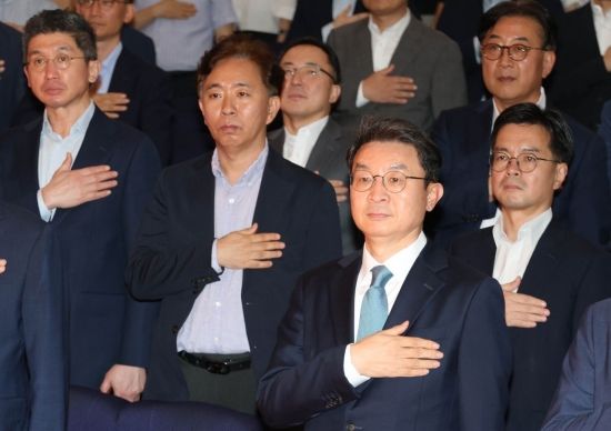 이억원 신임 금융위원장(앞줄 오른쪽)이 15일 서울 종로구 정부서울청사에서 열린 취임식에서 참석, 국민의례를 하고 있다.