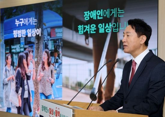 오세훈 서울시장이 16일 서울시청에서 '2530 장애인 일상활력 프로젝트' 발표를 하고 있다. 이번 발표는 장애인들이 우리 사회의 구성원으로 '아주 보통의 하루'를 누릴 수 있도록 일자리, 주거, 이동권, 인권의 4대 분야 지원으로 힘겨운 일상이 아닌 활력 넘치는 일상을 만들어가는 것이 주된 내용이다.