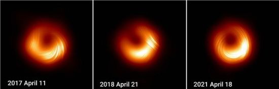 사건지평선망원경(EHT)으로 관측한 M87 블랙홀 영상, 왼쪽부터 2017년, 2018년, 2021년 결과를 나타내며 고리 위 가느다란 선은 자기장의 크기와 방향을 의미한다. 블랙홀의 그림자와 고리의 크기는 거의 일정하지만, 가장 밝은 부분의 위치와 자기장의 형태가 연도별로 변화하는 것을 확인할 수 있다. 우주항공청 제공.