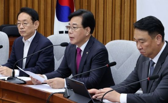 송언석 국민의힘 원내대표가 16일 국회에서 열린 원내대책회의에서 발언하고 있다.